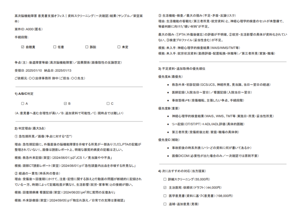 ※後遺障害等級の認定・訴訟結果等の保証はできません(提供資料に基づく整理・評価支援です)。
